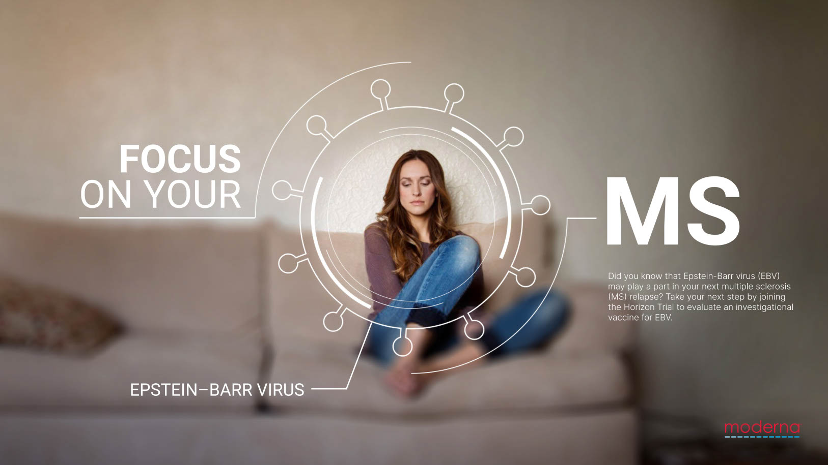 These concepts explore options for a clinical trial recruitment campaign aimed at people living with MS. Primary audience is a 25-45 year old womn in the prime of her life concerned with advancing MS symptoms but potential unaware of the relevance Epstein-Barr Virus might play in their advanceent.